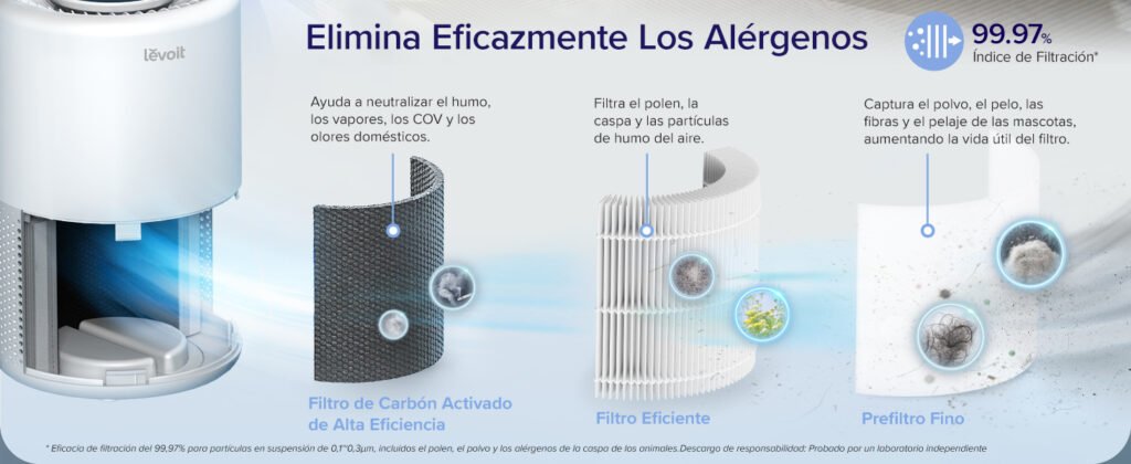 Cuenta con un sistema de filtración compuesto por prefiltro, filtro de carbón activo y filtro HEPA H13, que elimina hasta el 99,97 % de las partículas ultrafinas, incluyendo polvo, polen, humo, caspa de mascotas y contaminantes en suspensión.