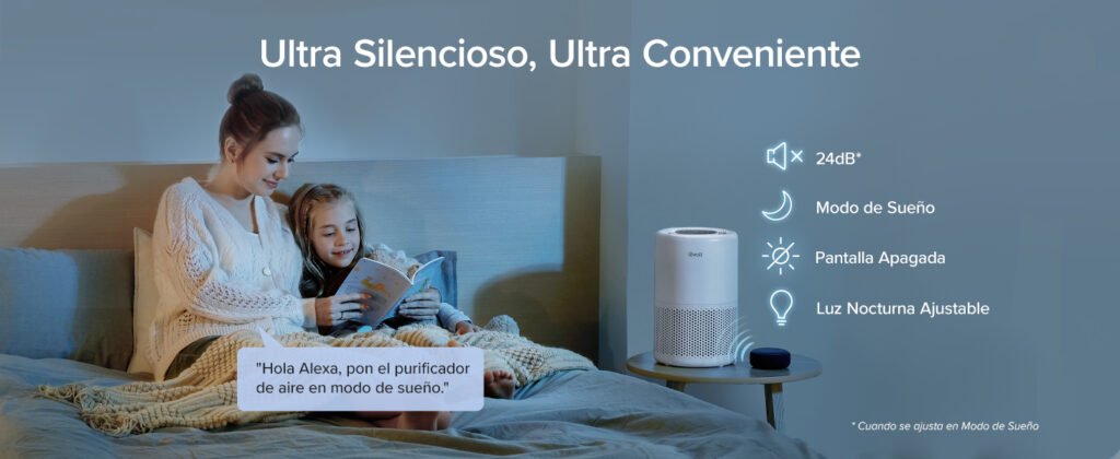 Con un nivel de ruido que desciende hasta los 24 dB en su modo más bajo, este purificador puede permanecer encendido durante la noche sin perturbar el descanso. Es perfecto para quienes valoran la tranquilidad mientras duermen o trabajan.
