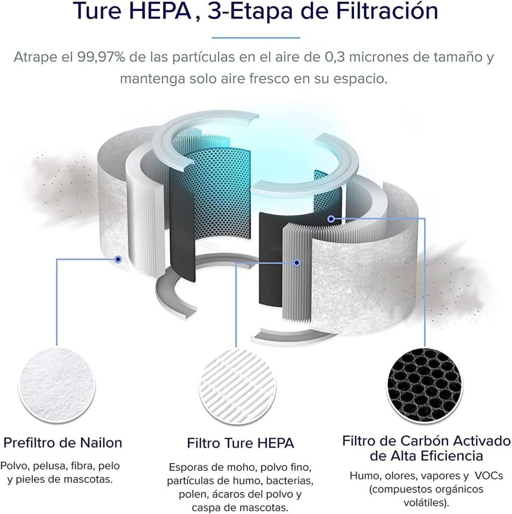 Se adapta fácilmente a dormitorios, despachos o salas pequeñas sin ocupar demasiado espacio. - Filtración HEPA de alta eficiencia